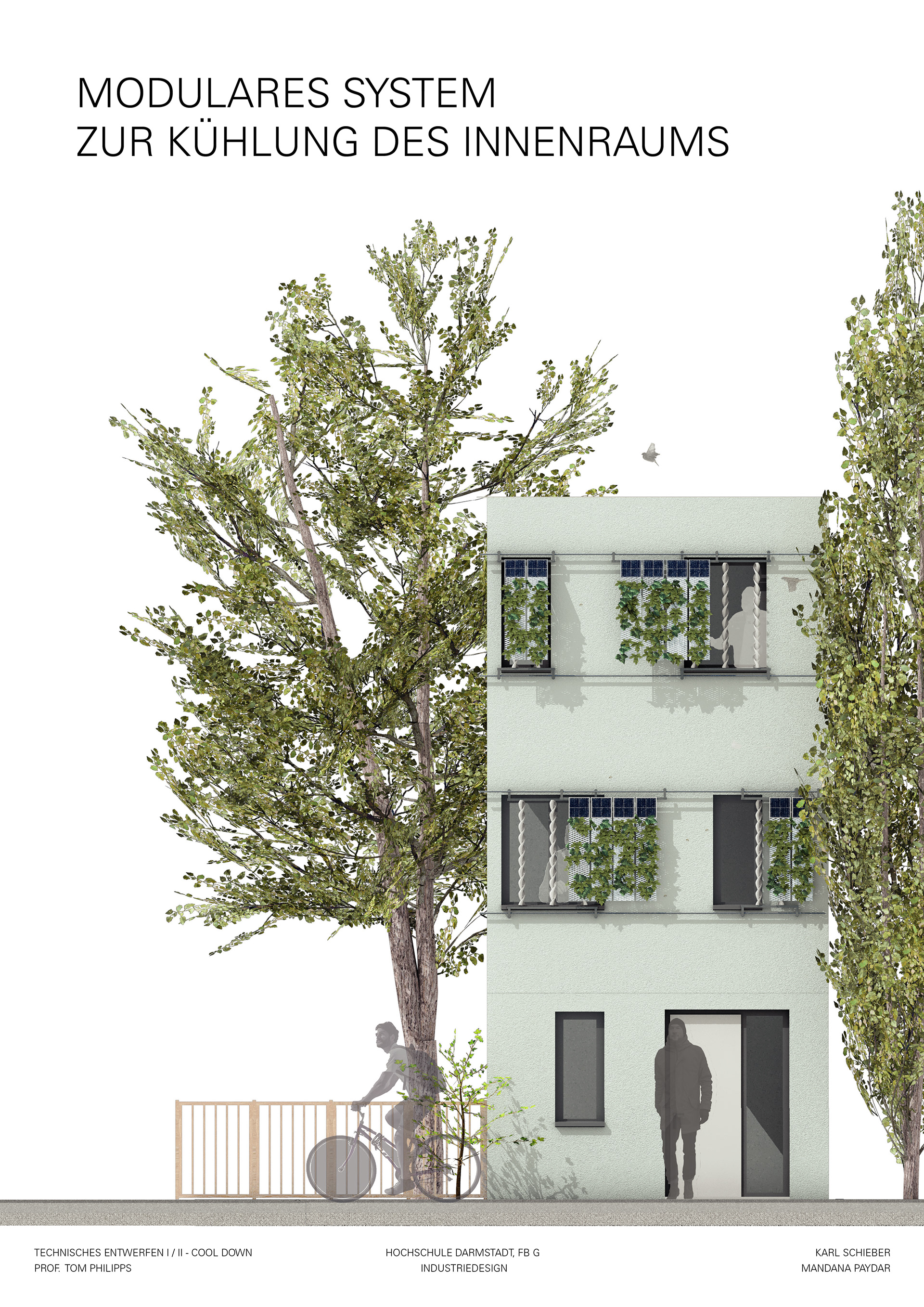 Pflegeleichte Pflanzen spenden Schatten und kühlen somit indirekt. Das autonome System generiert durch PV Panele und Windkraftrotoren selber Strom, um dann mit Hilfe des bernoullischem Effektes den Raum zu belüften.
